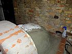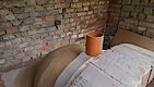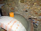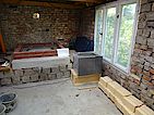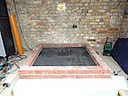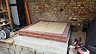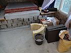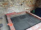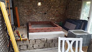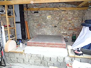 Voll-Mauersteine mit Struktur als Aufnahme für die Dämmung und die Schamottsteine. Rechts liegt schon das Schaumglas als Dämmung und die Schamottsteine bereit.