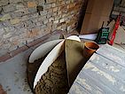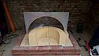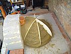 Keilsteine (Wölber) für einen 500mm breiten Portalbogen (Radius 250mm) liegen bereit. Die Schablone dahinter ist später für das Prüfen der Dicke der Betonkuppel. Geplant ist ein Sandnegativ (Backinnenraum) mit Radius 400mm und eine Betonkuppel mit Radius 500mm. (Volumen von Kugel R500 - Volumen von Kugel R400) * 0.5 = ca. 120Liter, also ca. 250kg Feuerbeton.