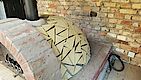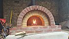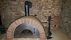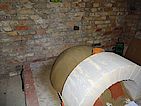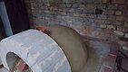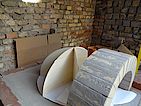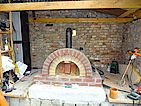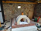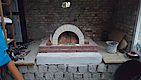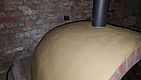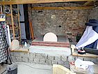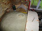 Die Kuppel hat eine durchschnittliche Dicke von 10cm +- 2cm. Als alles fertig war gleich mal das Ofenrohr mit Rauchklappe draufgestellt und 24 Stunden gewartet. Vorne seht ihr bereits das Außenportal aus den selben Steinen wie der Sockel, aber vom Wasserstrahler konisch geschnitten. Danke hier an Jörg.